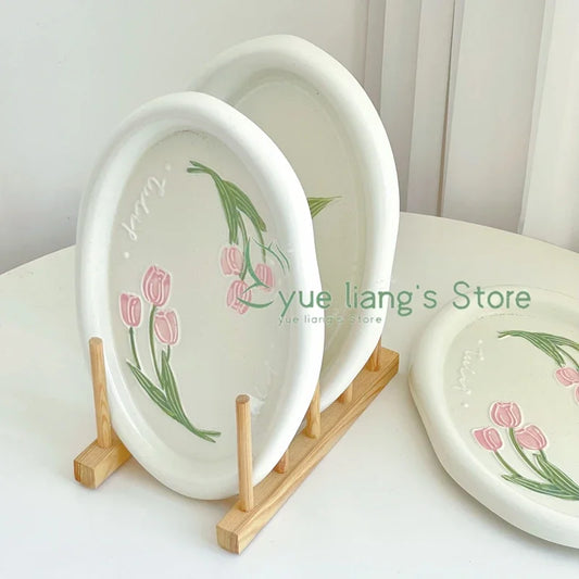 Hand-painted Relief Ceramic Plates Tulips Lovely Girls Household High-end Beautiful Tableware Platos Decorativos Mesa