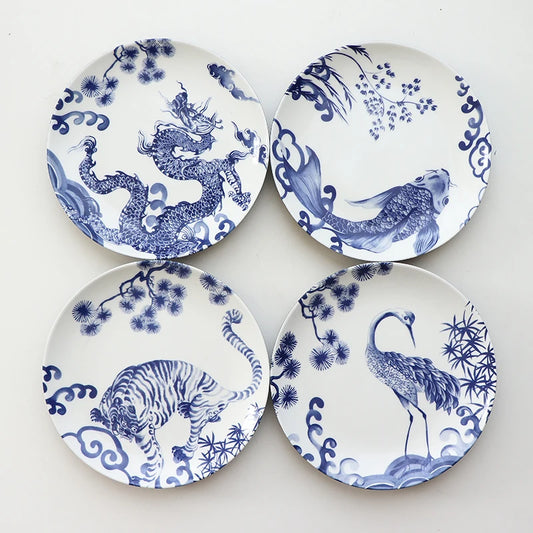 Chinese Painted Auspicious Animals Dessert Plates Vintage Blue and White Underglaze Ceramic Dinner Plate Afternoon Tea Tableware