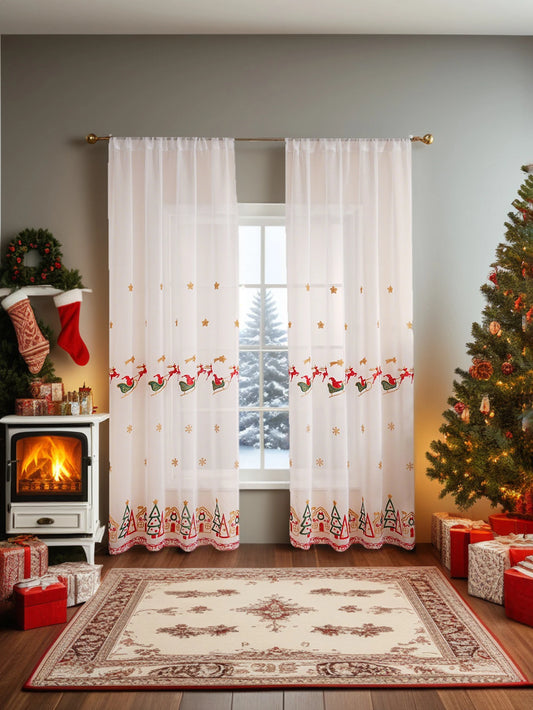 1PC Christmas Reindeer Sleigh Embroidered Tulle Pole Curtain for Living Room Bedroom Holiday Party Decor