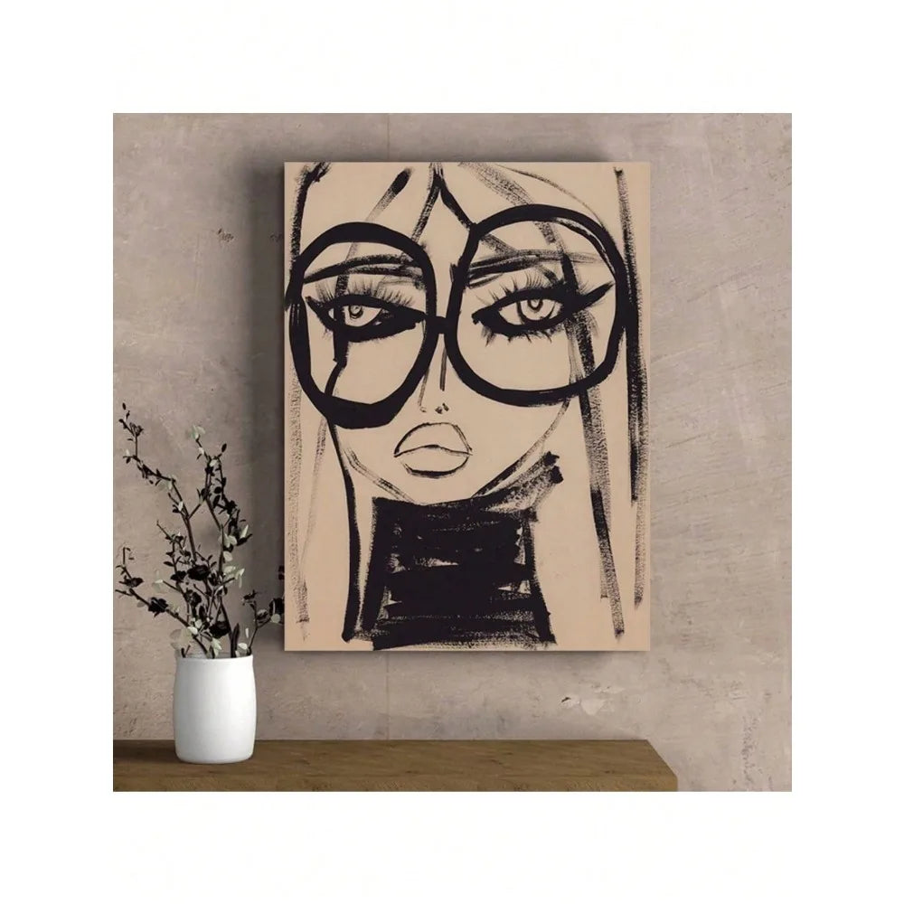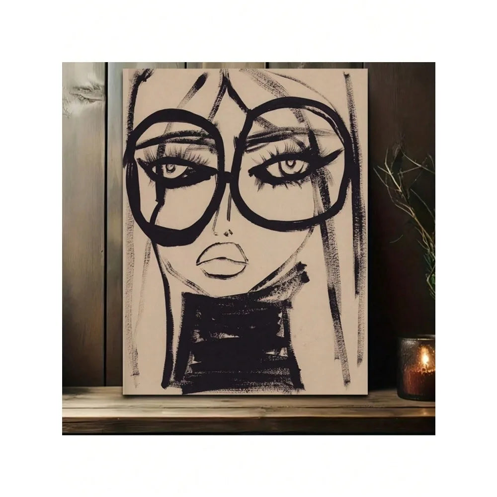 1pc Art Deco Abstract Woman w/Glasses Canvas Print,Black&White Pine Frame,Home/Office Decor,Birthday/Graduation Gift