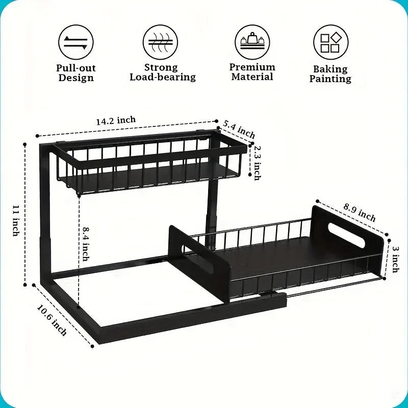 2-Tier Sliding Under Sink Shelf Pull-Out Cabinet Organizer Durable Metal Storage Rack for Kitchen Bathroom Storage Solutions
