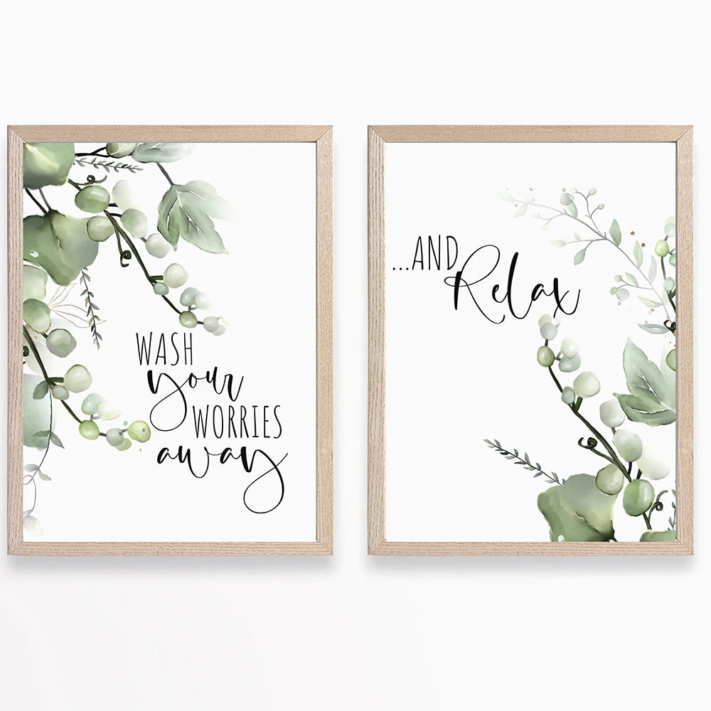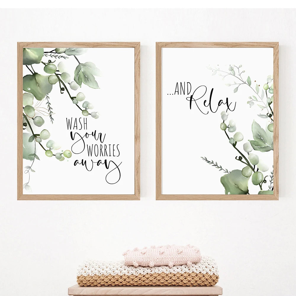 Bathroom Poster HD Print Canvas Painting Botanical Tropical Leaves Wash Your Worries Away And Relax Quote Wall Art Picture Decor