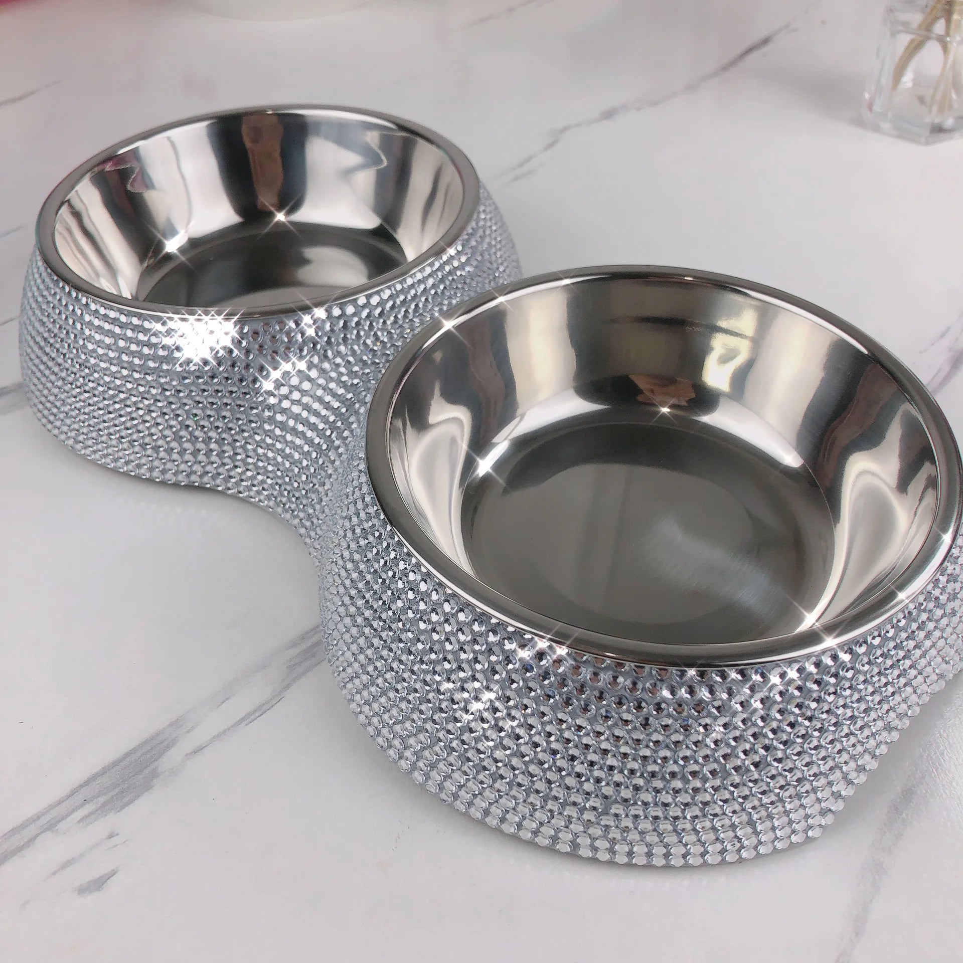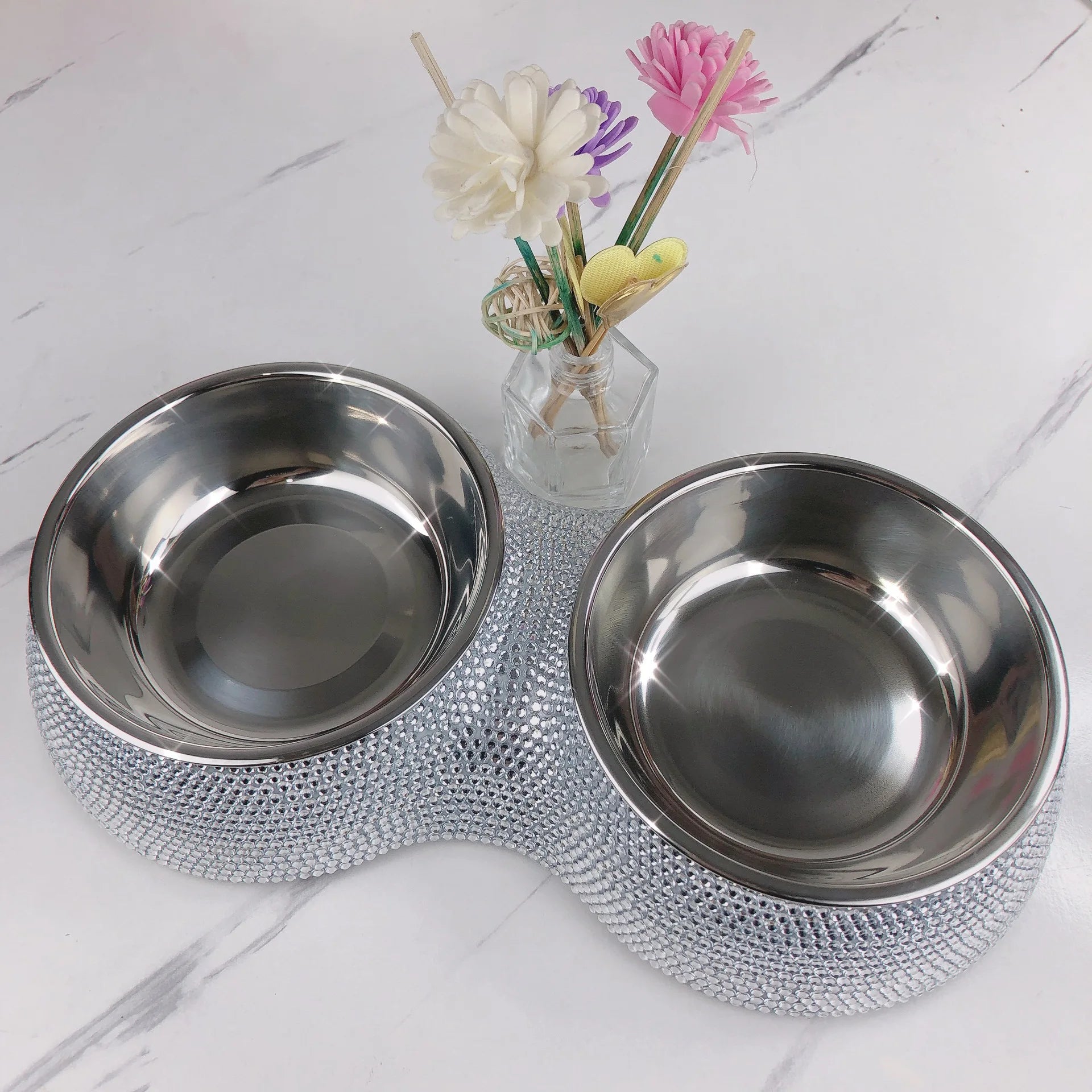 Creative Rhinestones Stainless Steel Double Dog Cat Food Bowl Sparkling Pet Cat Dog Bowl Pets Feeders Pet Supplies Accessories