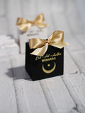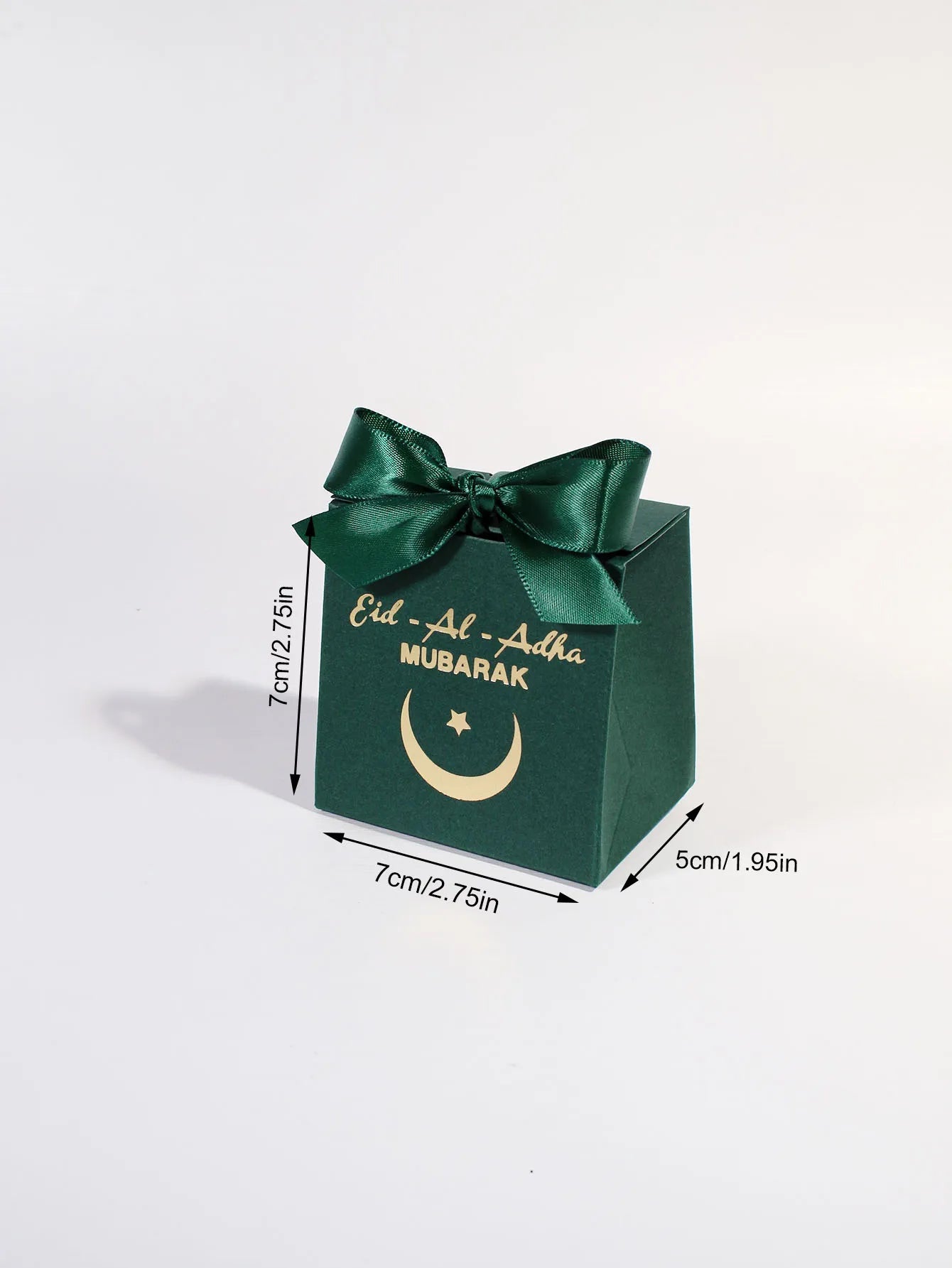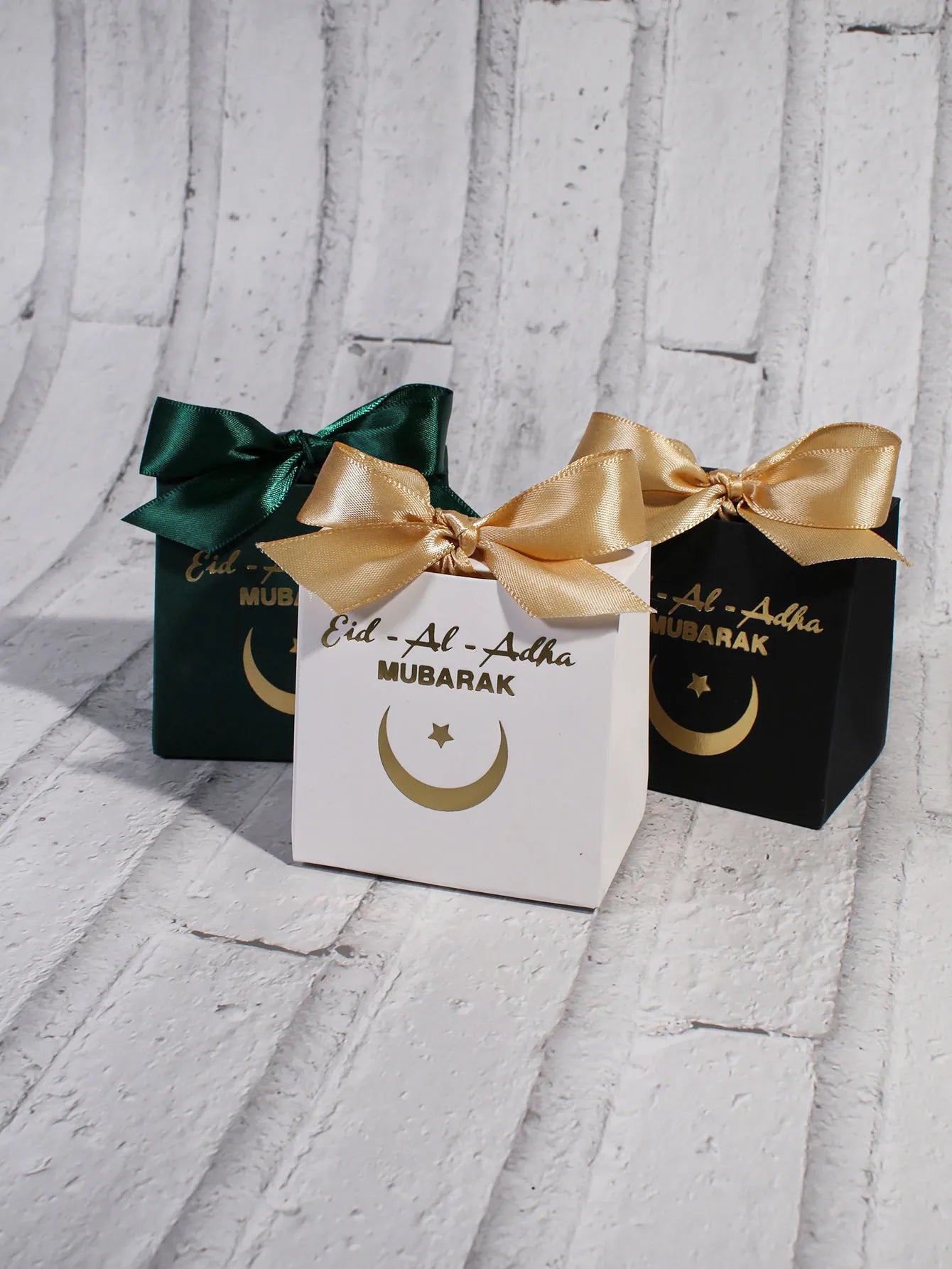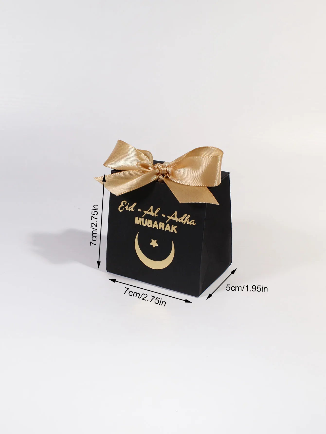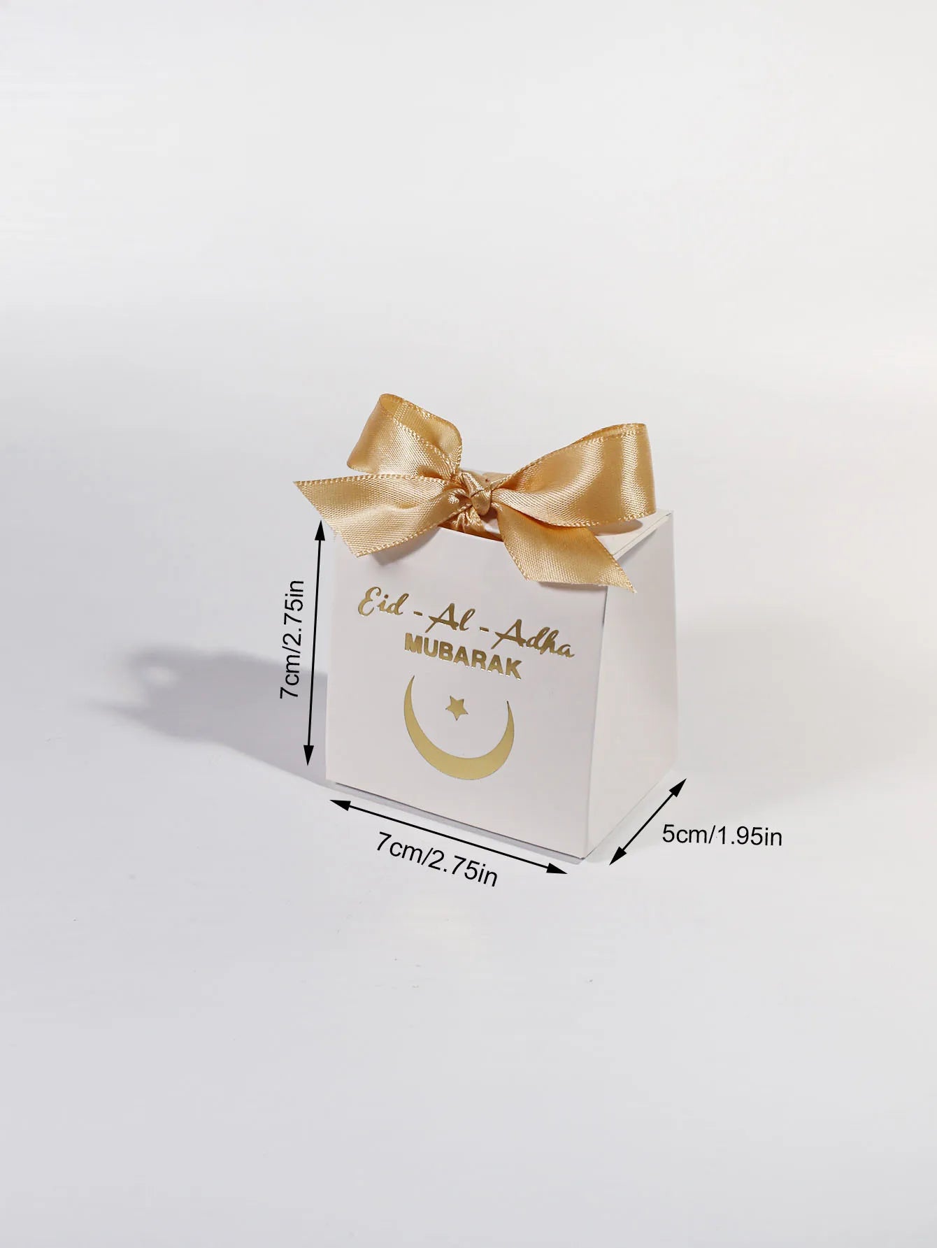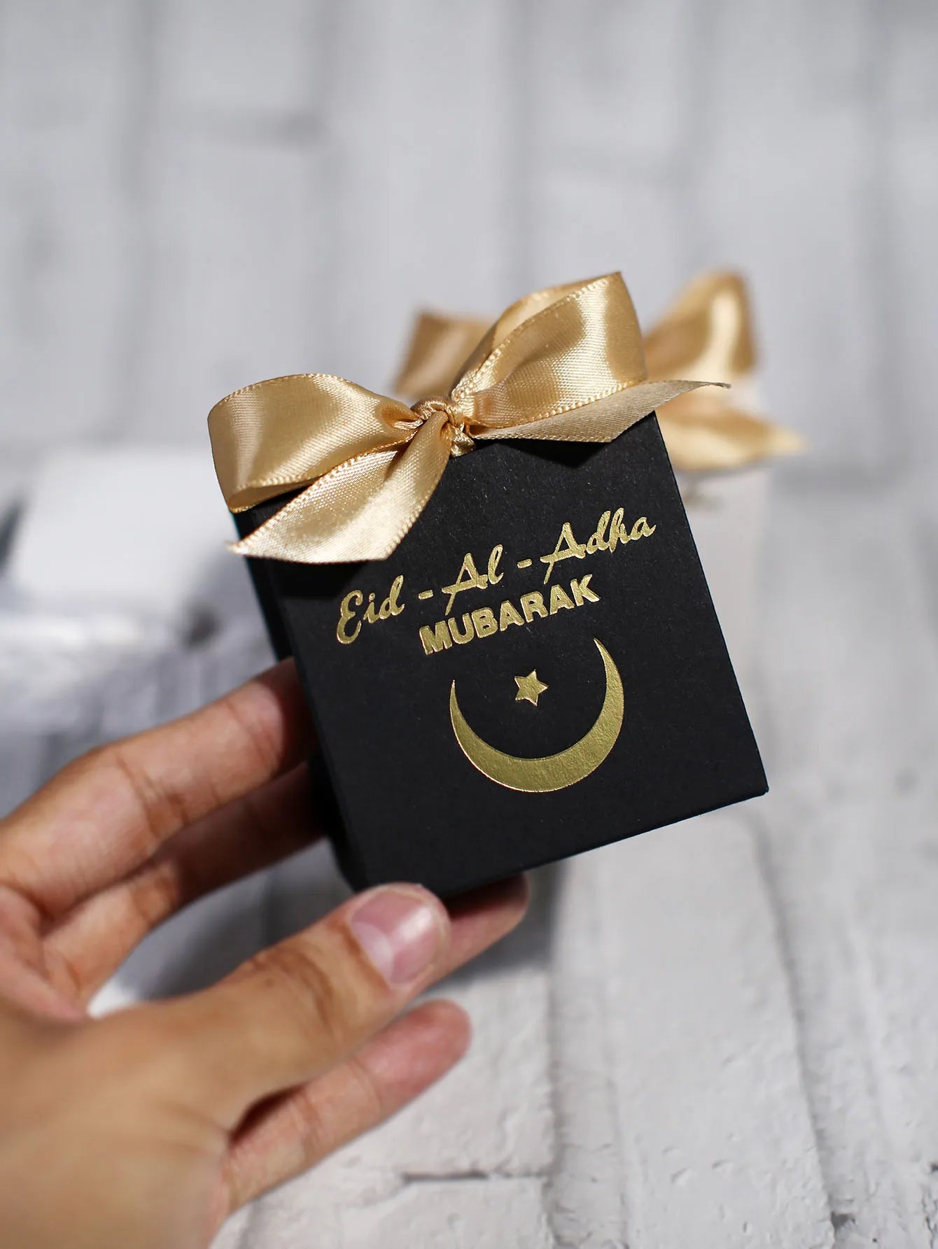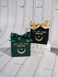 Eid al Adha Gift Box with Golden Ribbon, featuring crescent and star patterns, perfect for gifting to friends and family