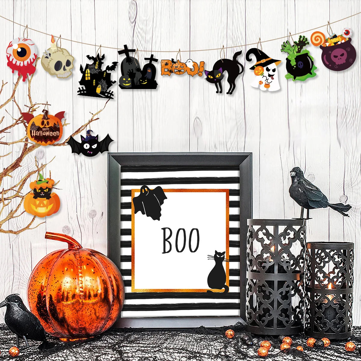 Halloween Wooden Hanging Ornaments Halloween Tree Decorations Ghost Pumpkin Skull Ghost House for Trick or Treat Party Supplies