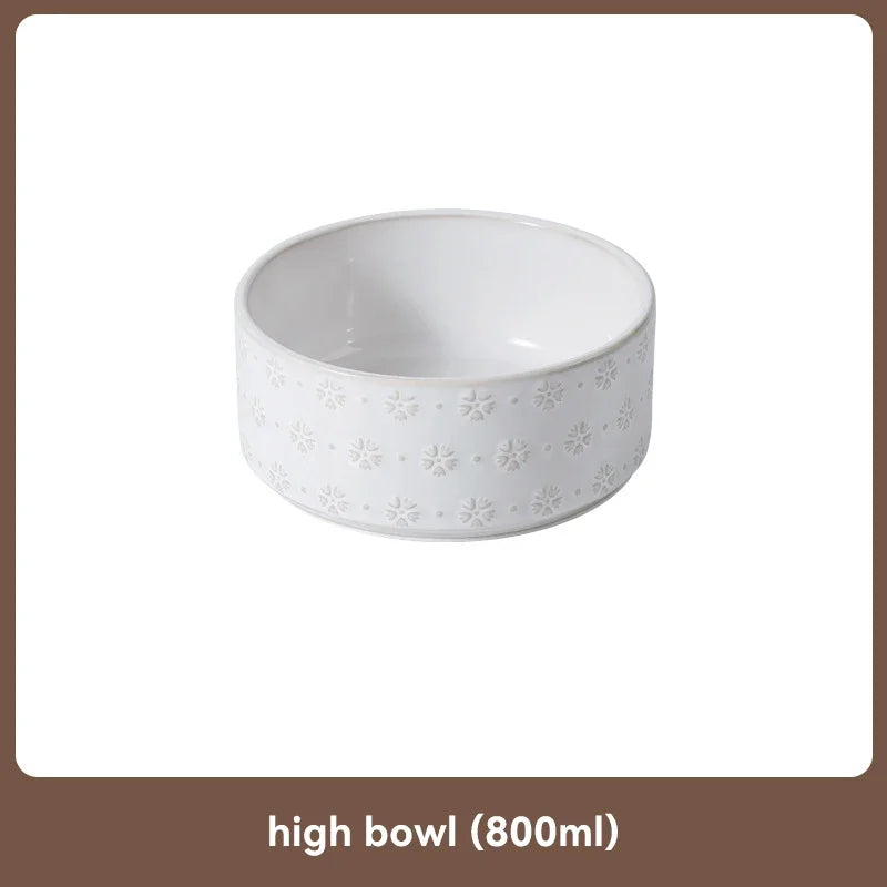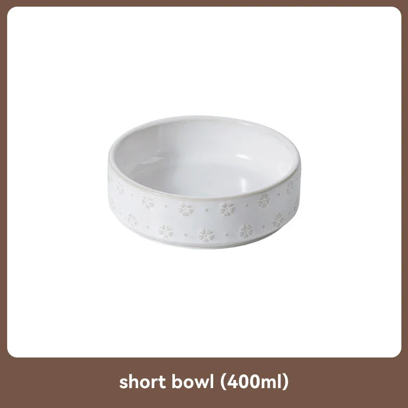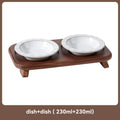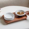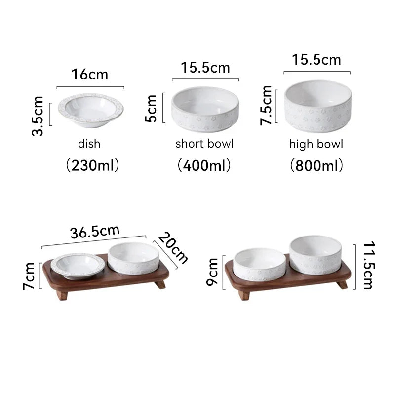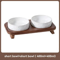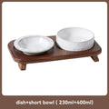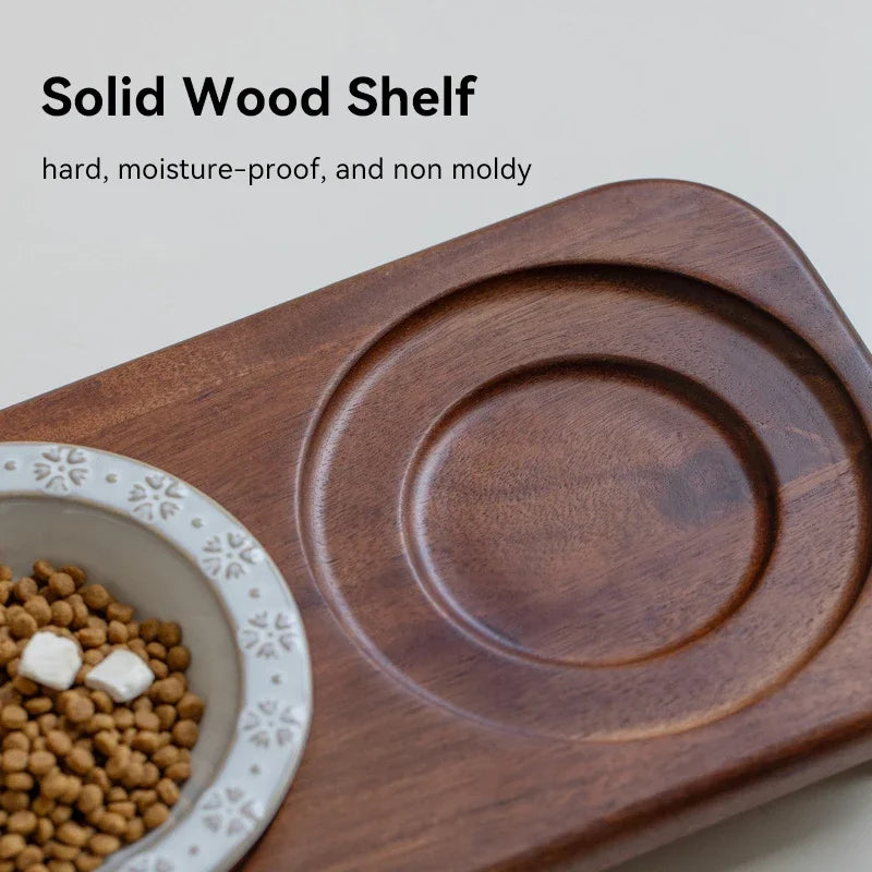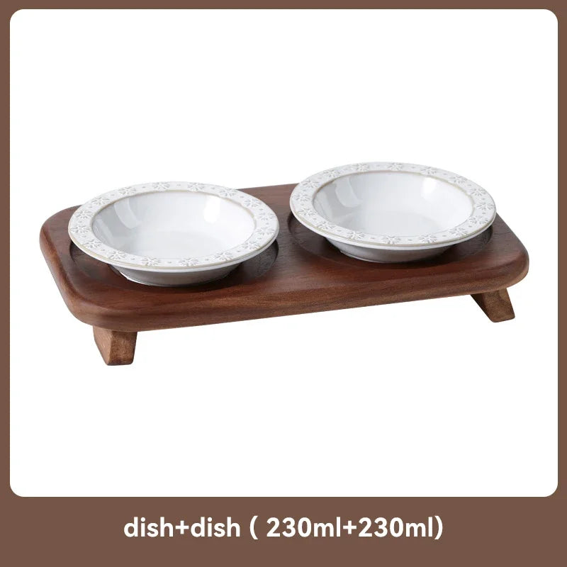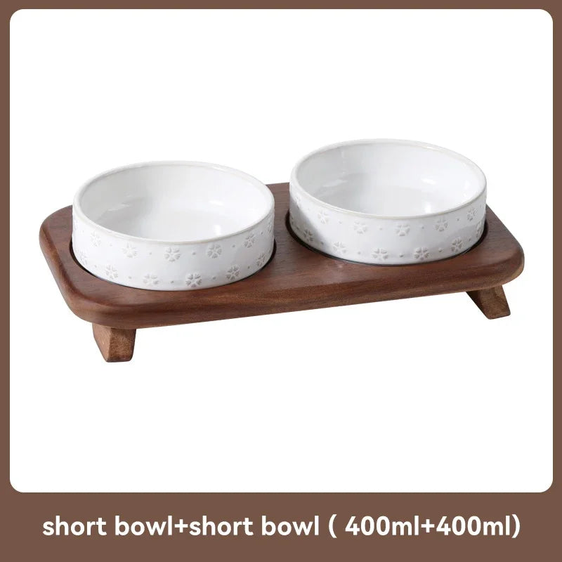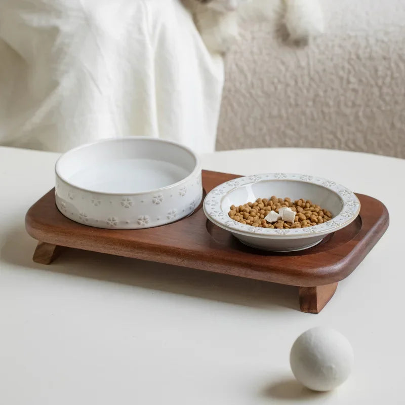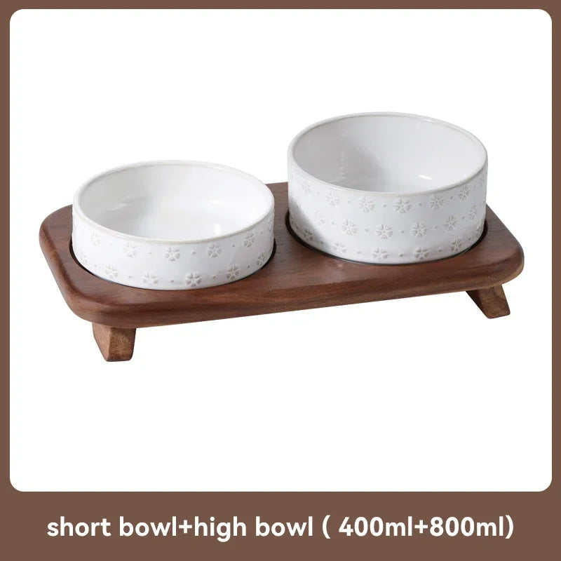 Vintage Embossed Ceramic Pet Bowls with Solid Acacia Wood Stand – Non-Slip Dual Food and Water Dish Set for Cats and Small Dogs