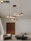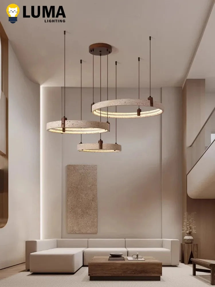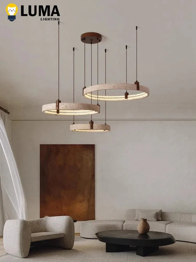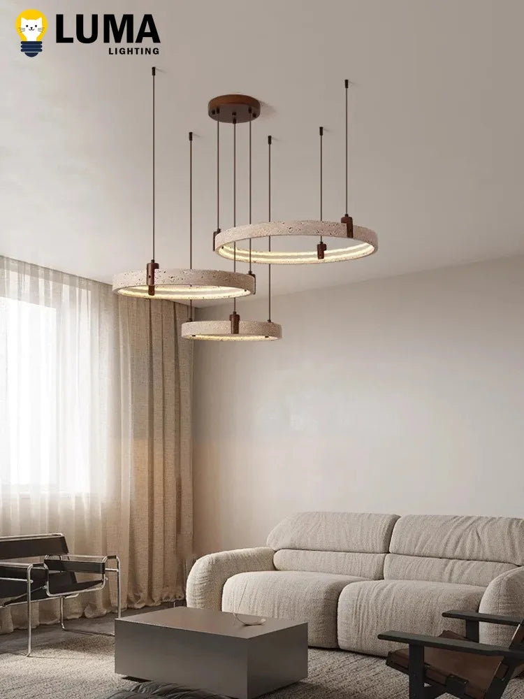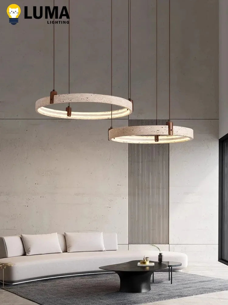 Wabi-Sabi Japanese Style Yellow Travertine Ring Chandeliers, Natural Cave Stone Circle Pendant Light Livingroom Home Decor